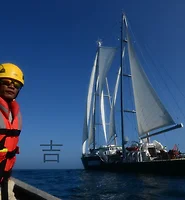 사육사는 코끼리를 물속으로 유인하기위해 수박 한통을 물속에 던졌다.