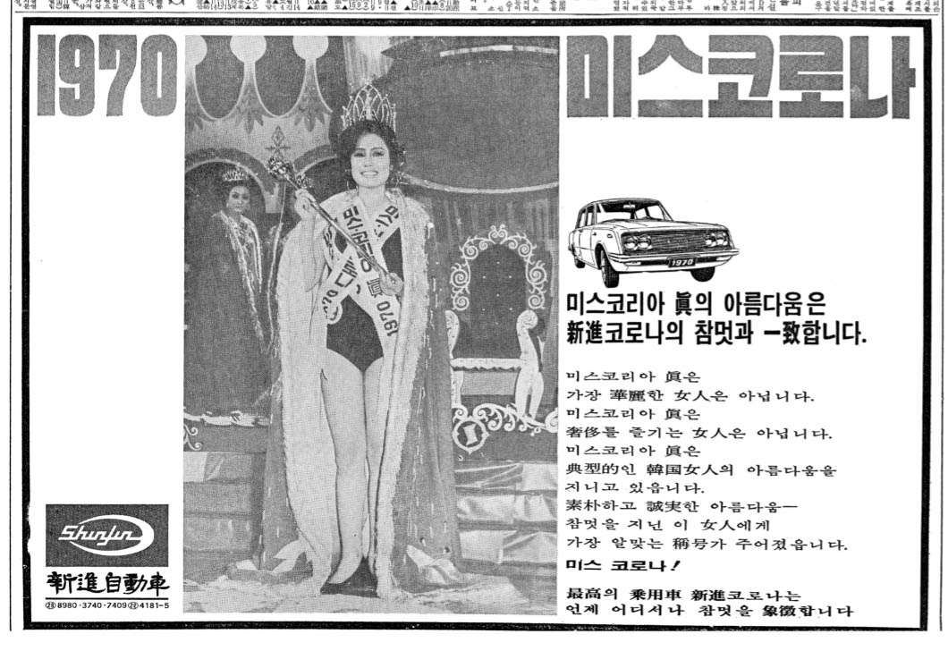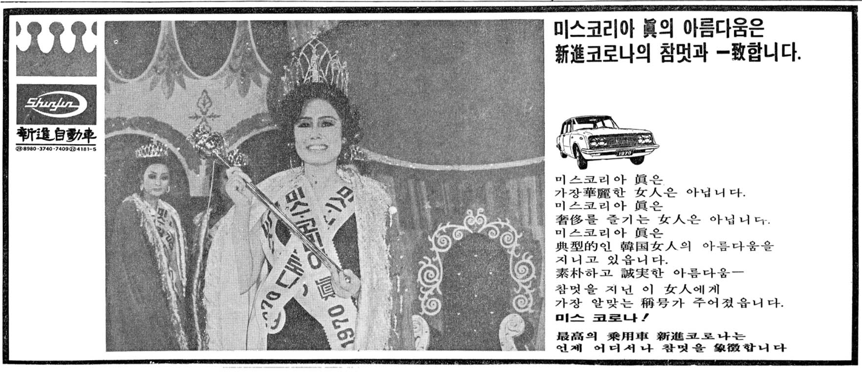 1970년대 신문지면에 개재된 신진자동차의 코로나 광고를 찾아봤다. 구름 위를 달리는 것 같은 포근하고 안락한 드라이브(1970년 2월28일), 더 넓어지고 강해지고 안전해진 신진코로나 세븐티 탄생(1970년 7월8일), 지구 둘레 10바퀴 거리를 달려도 이상 없는 승용차(1971년 7월13일)……. 이 중 제일 재밌는 광고는 1970년 4월8일 광고다.
