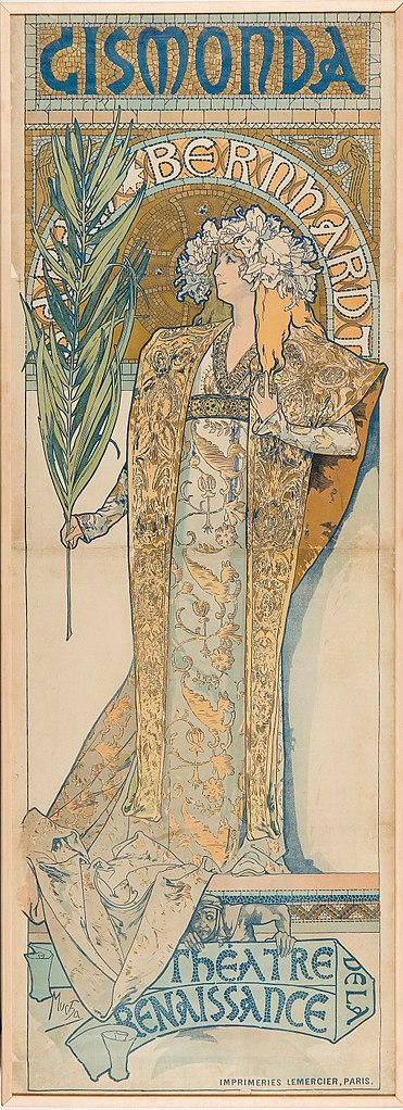 귀스타브 도레 등의 화가들이 사라 베르나르을 그렸지만 그녀의 개성을 가장 잘 표현한 것은 연극 포스터였다. 크리스마스 다음 날인 1894년 12월26일, 베르나르는 르메르시에 인쇄소에 전화를 걸었다. 빅토리앵 사르두의 '지스몽다' 홍보 포스터를 새로 제작해달라는 주문이었다. 하지만 인쇄소에는 포스터를 그리고 디자인할 정규직 직원들은 모두 크리스마스 휴가를 떠난 상태였다. 곤란했지만 인쇄소는 연휴동안 인쇄소에서 일하기로 한 무명의 화가에게 일을 맡길 수밖에 없었다. 체코 출신 화가 '알폰스 무하'다.